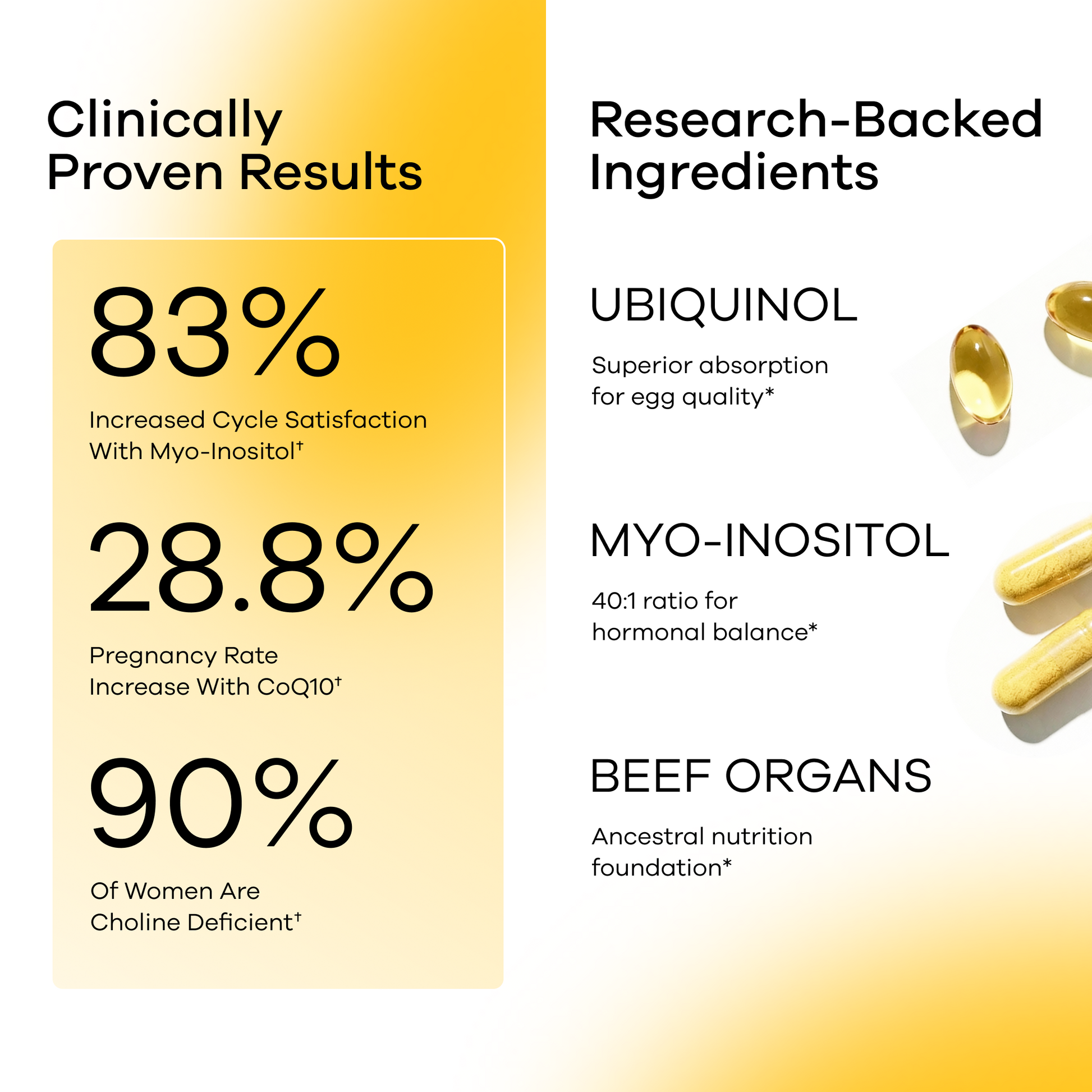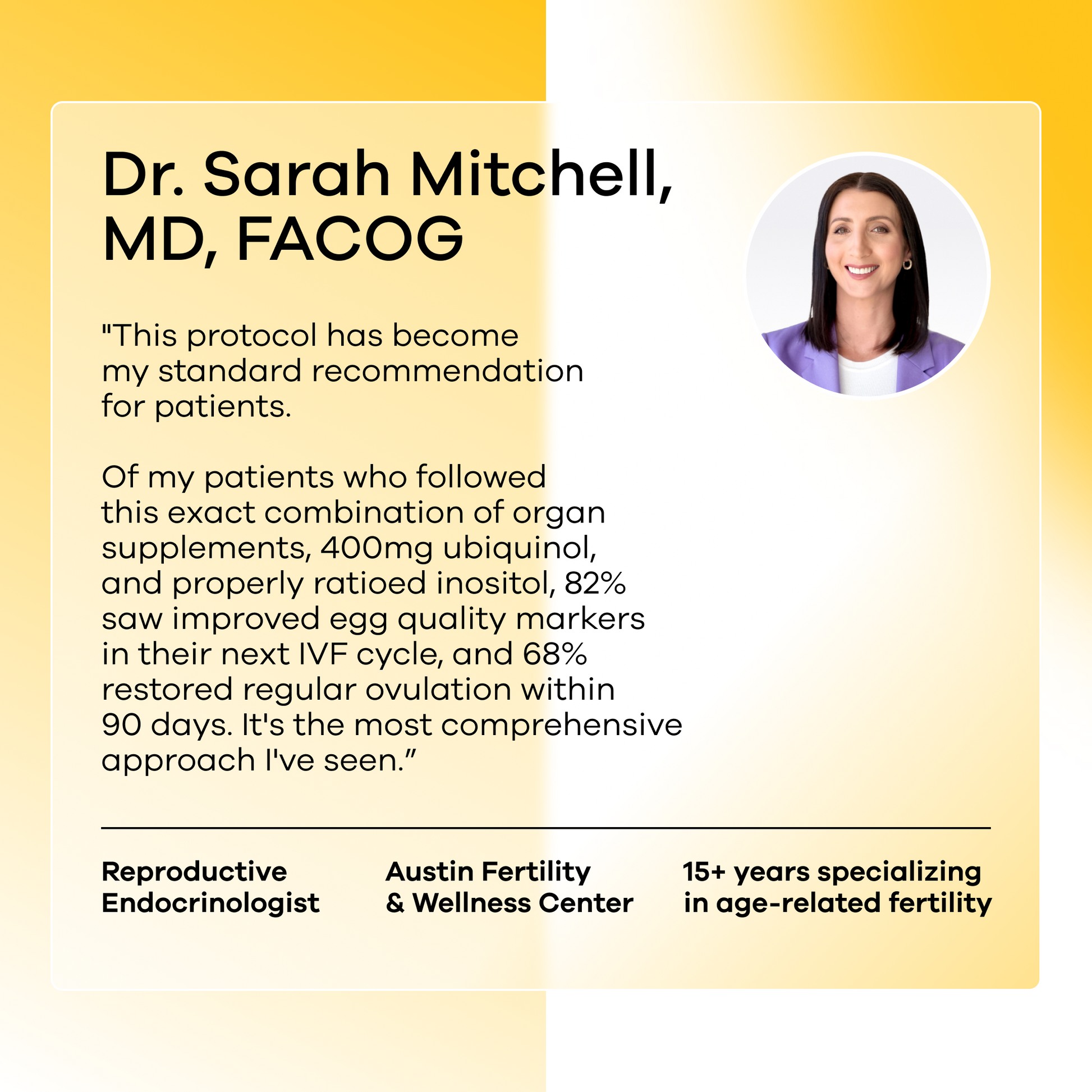 Support egg quality, cycle regularity, and hormonal balance with clinical-dose fertility nutrition. The protocol delivers 2000mg organs, 4000mg myo-inositol (40:1 ratio), and 400mg ubiquinol CoQ10 daily.